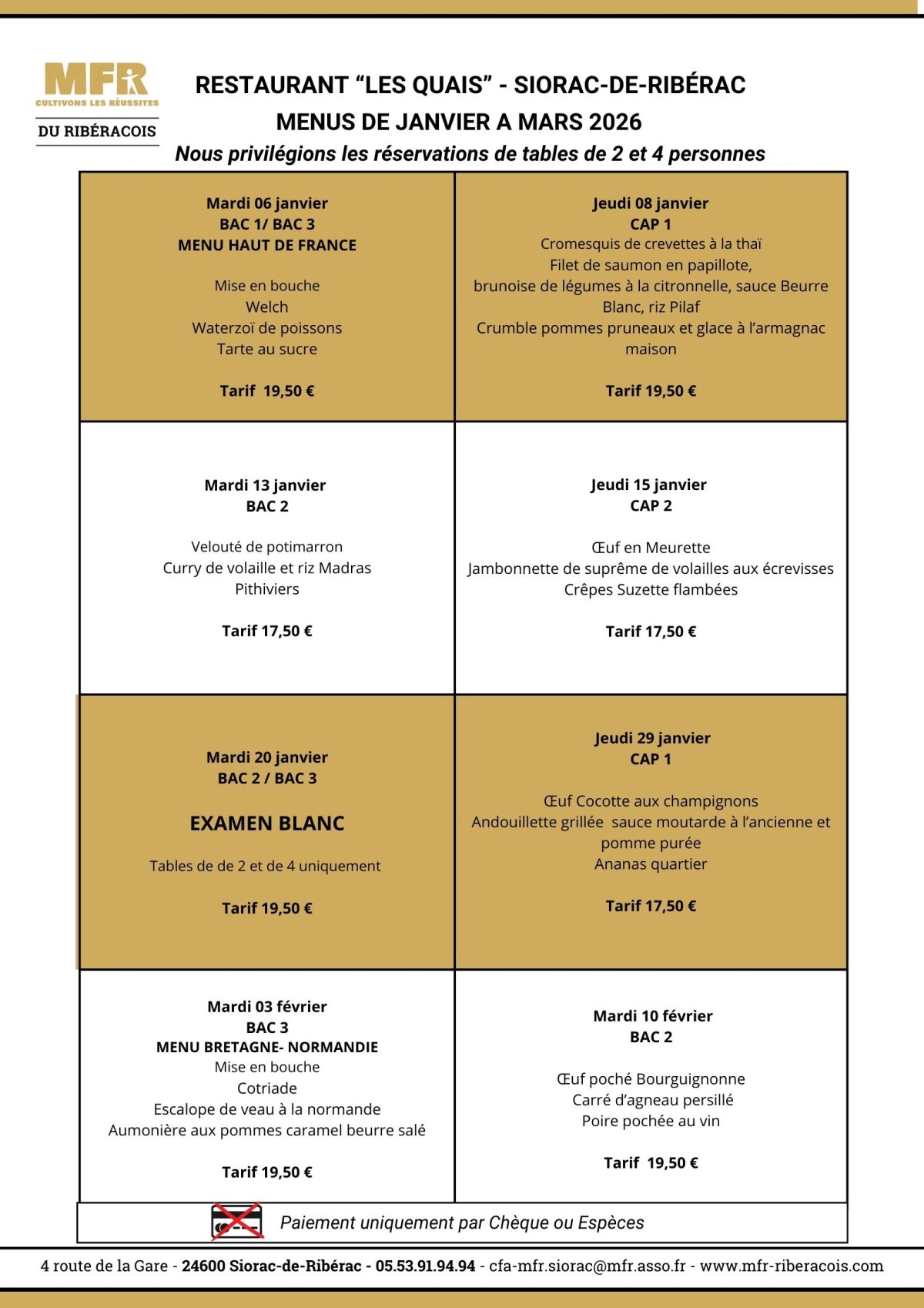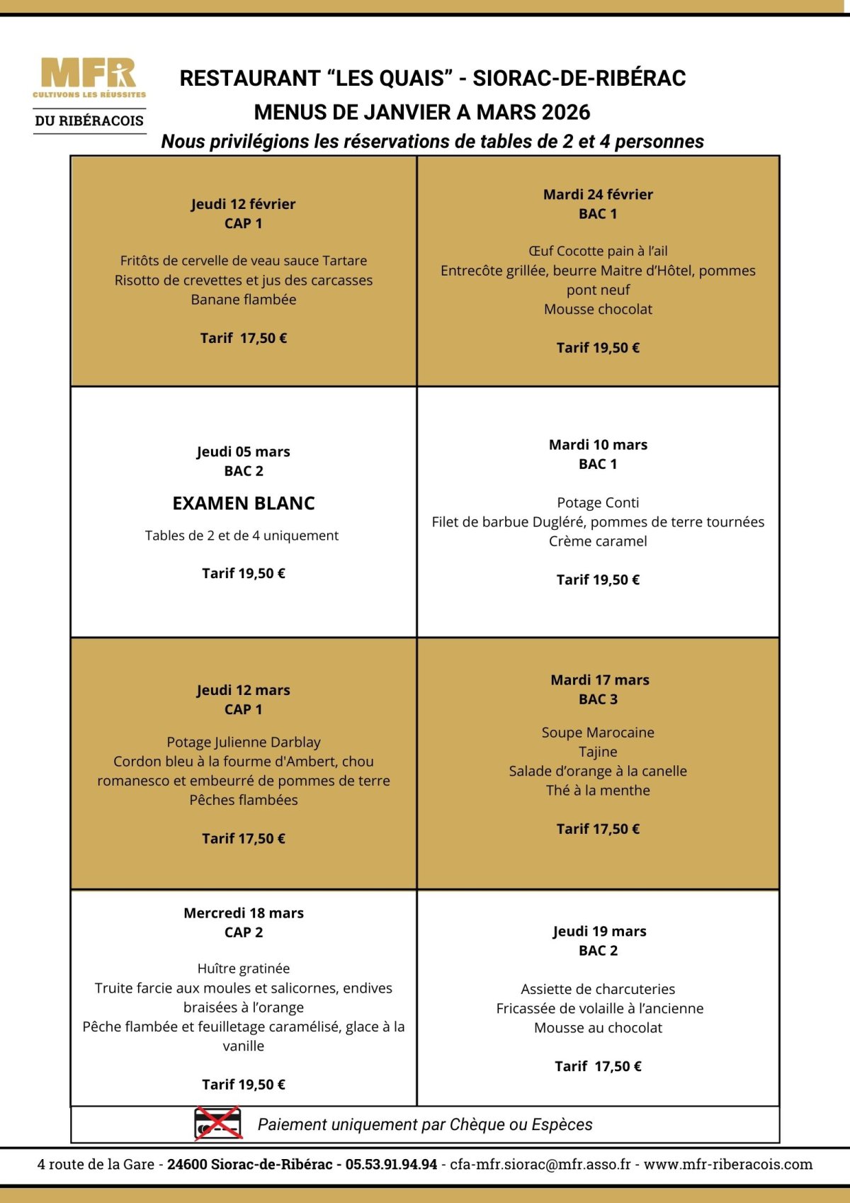 - Le menu du jour sera sans choix, afin de répondre aux objectifs pédagogiques des apprenants de la MFR. Lors de votre réservation, merci de consulter le menu afin d'être sûr qu'il vous convienne. En cas d'allergies alimentaires, merci de le préciser lors de votre réservation.